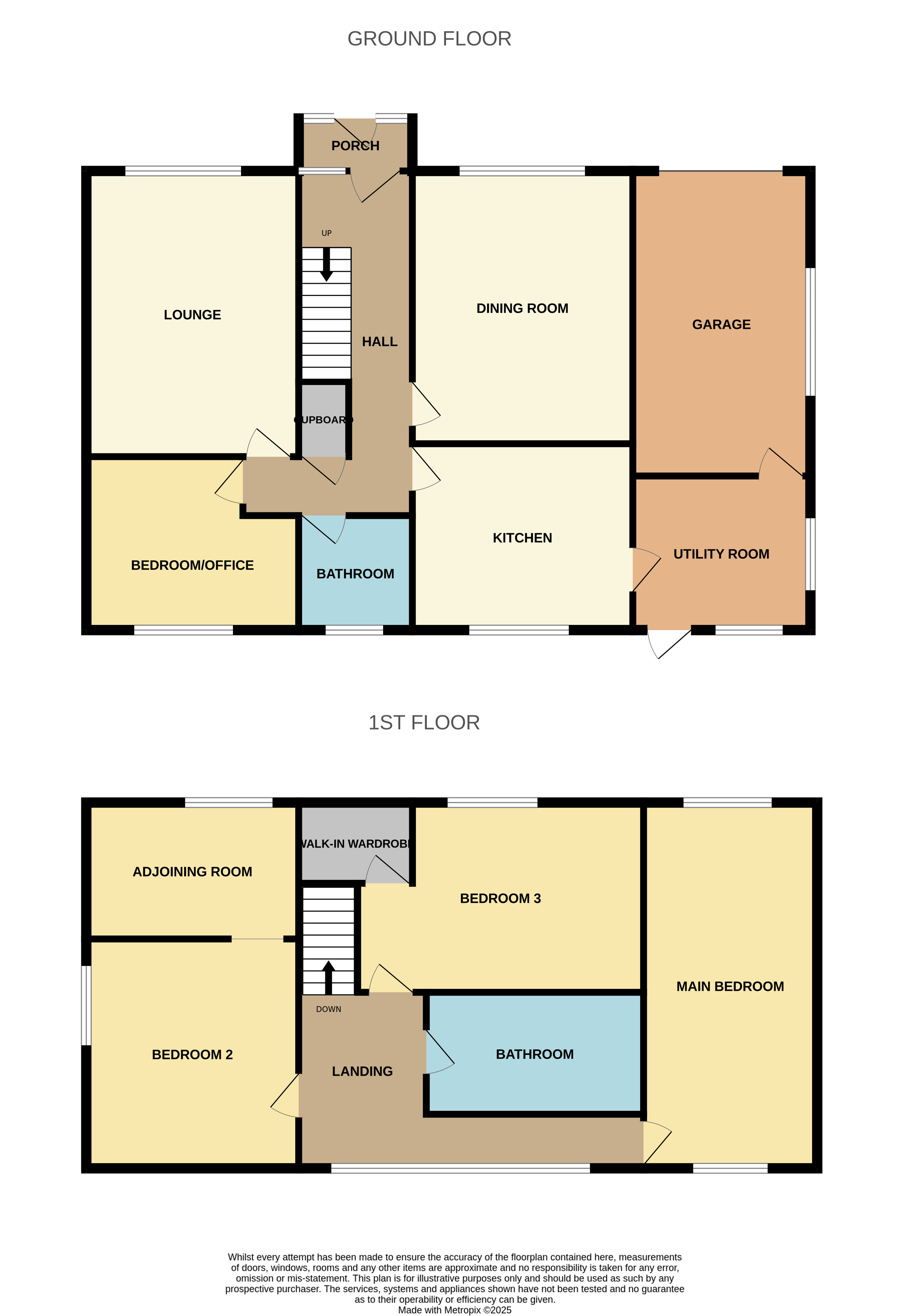 Accessed from the kitchen and with a door leading to the garage, the utility room is generously sized with space for a full-sized fridge/freezer, it is plumbed for a washer, and there is a sink and cupboards. A door opens onto the back garden.