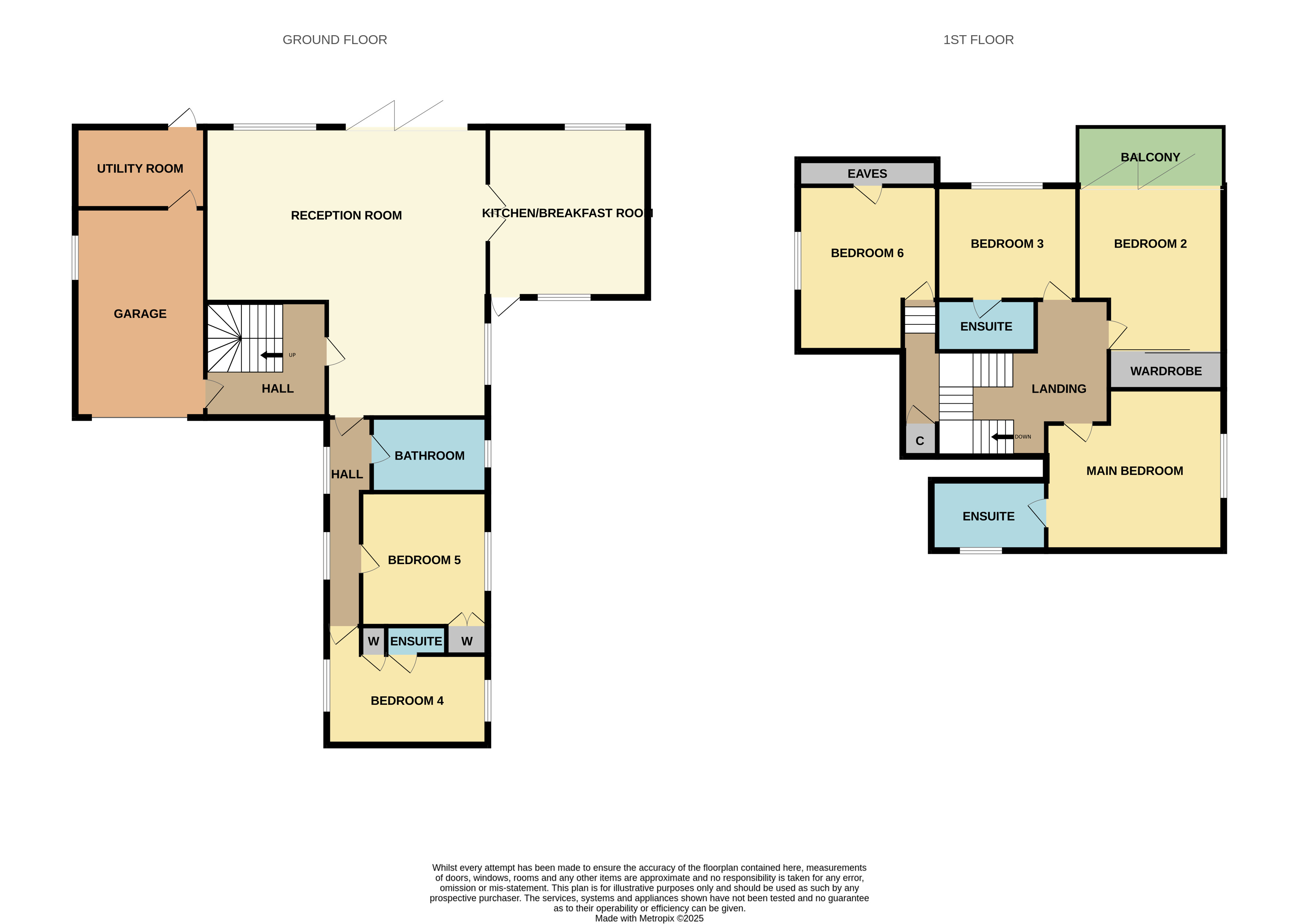 Stairs from the entrance hall rise to the 1st floor, which is multi-level. It provides access to the main bedroom, bedrooms 2, 3, and 6. There is an integrated cupboard.