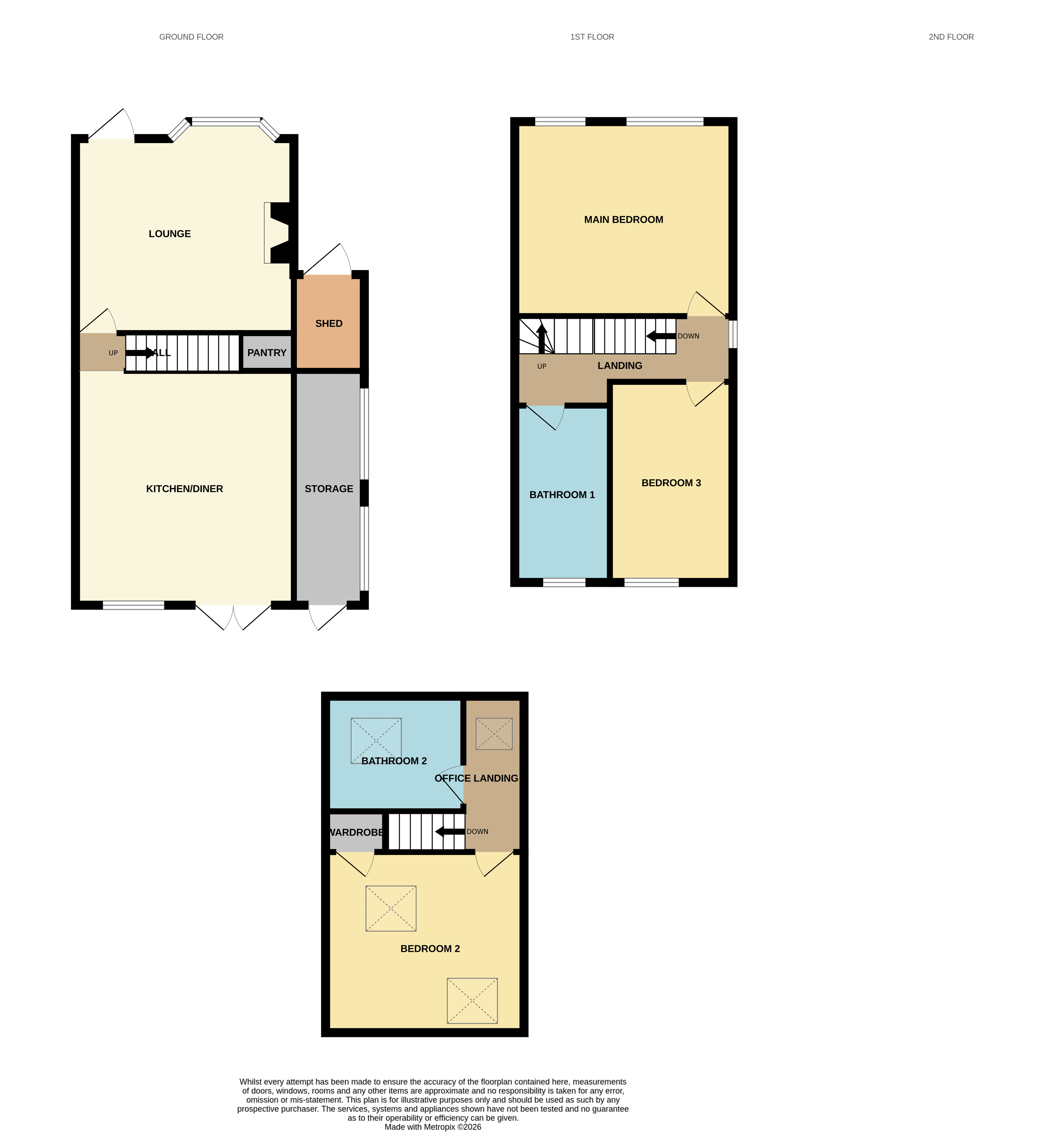 Stairs from the downstairs hall between the lounge and kitchen/diner rise to the 1st floor landing, which provides access to the main bedroom, bedroom 3, the shower room, and further stairs rising to the 2nd floor landing. There is an integrated cupboard utilitising space beneath the stairs.